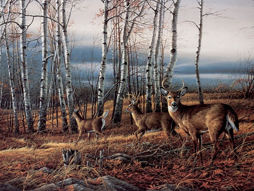 Los patos que luchan contra el viento, un sorprendido venado de cola blanca, una cabaña a orillas del lago, escondida entre el arbolado, una casa en la colina con ventanas iluminadas para recibir a los vecinos, niños de pesca, perros -familiares fieles- siguiendo, vigilando.